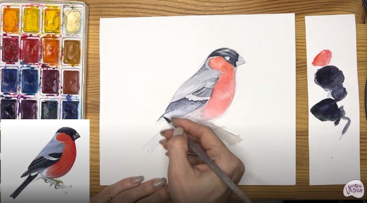 Так же проходим голову. Она у нас тоже будет черная. Этим цветом мы проходим именно свет на тёмных участках нашего снегиря.